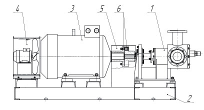 1. Насос 2. Рама 3. Электродвигатель 4. Вентилятор 5. Защитный кожух 6. Муфта